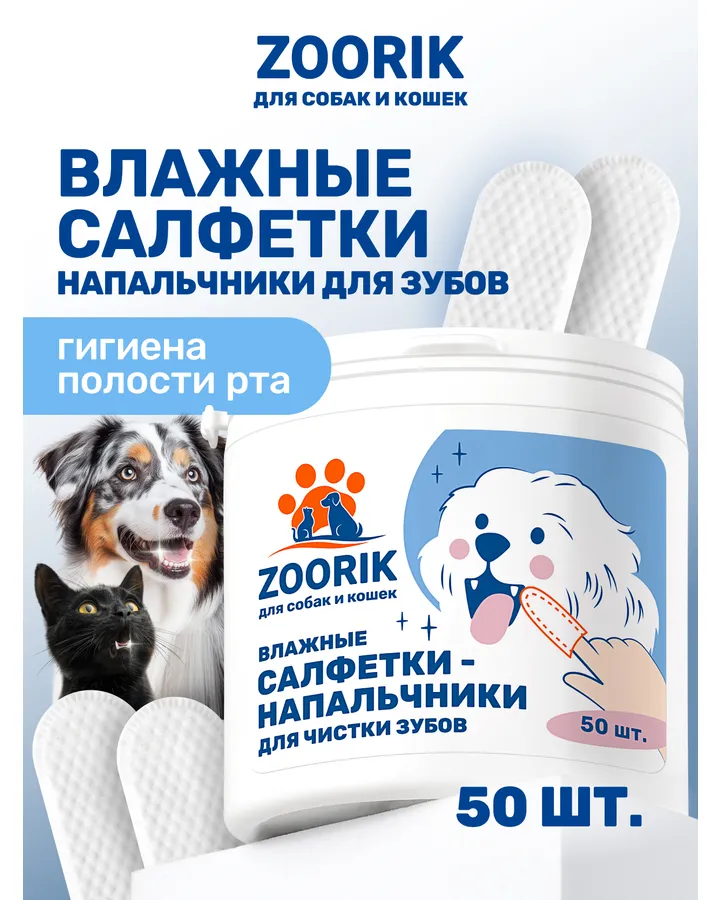 Влажные салфетки-напальчники ZOORIK для чистки зубов собак и кошек 50 шт