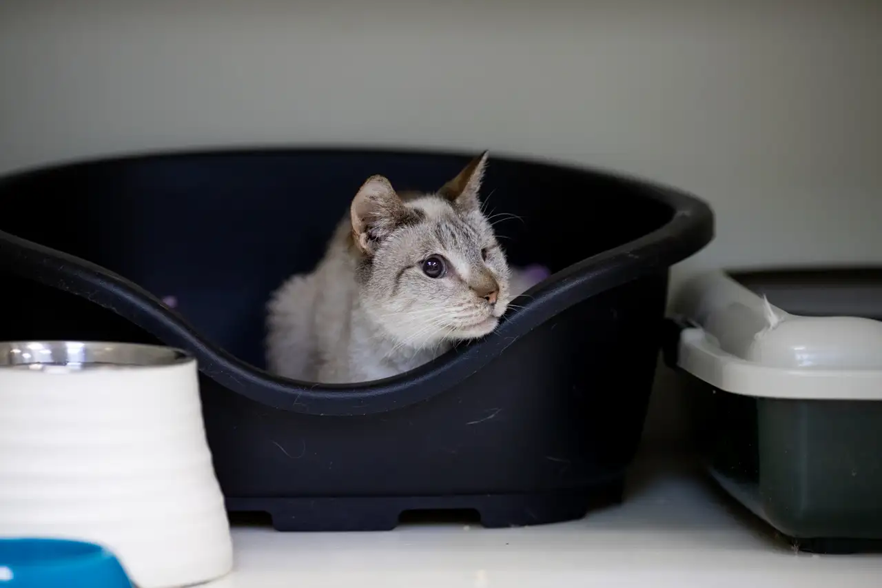 Тайские кошки славятся своей красотой: благородный окрас, голубые глаза. А ещё кошки этой породы безумно преданные — они привязываются к человеку и тяжело переживают разлуку с ним. Ахен уже сменила много мест пребывания, а хозяина так и не нашла. Поэтому она безумно скромная и трусливая: погладить себя даёт, но ближе не подпускает: ей просто страшно.