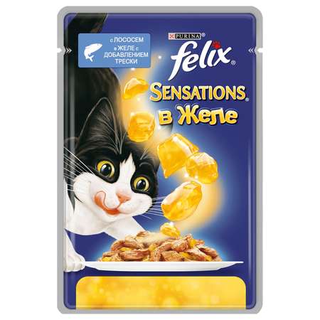 - Корм влажный для кошек Felix Sensations с лососем в желе со вкусом трески заказываю на сайте детского мира постоянно, тут очень выгодные цены. Корм сам по себе очень неплохой. Кусочки нежные, кошаку нравится. Даю по 1 пакетику несколько раз в день. Ему хватает.