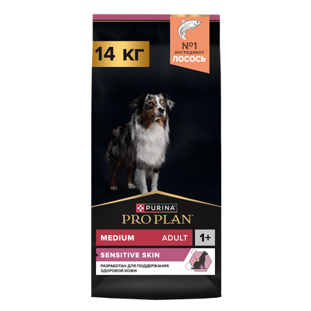 Изучая потребности собак на протяжении многих лет, команда квалифицированных ветеринарных специалистов и диетологов PURINA разработала сухой корм PRO PLAN Sensitive skin (для чувствительной кожи) — ежедневный рацион с высоким содержанием лосося для взрослых собак средних пород. Этот полнорационный корм сбалансирован по составу и помогает поддерживать здоровье чувствительной кожи.