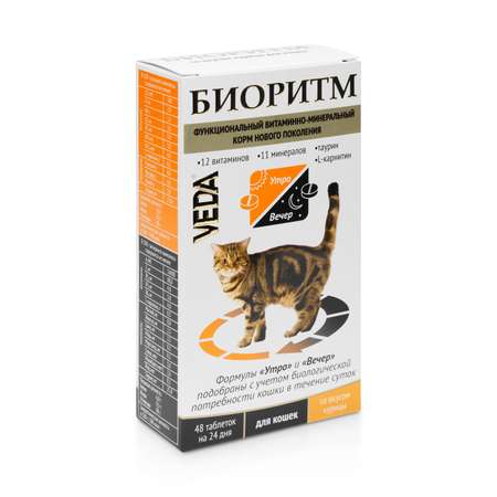 Витаминно-минеральный комплекс БИОРИТМ является функциональным (оздоровительным) кормом нового поколения. Содержит полностью усваиваемые формы витаминов и микроэлементов, разделенные на 2 приема, которые удовлетворяют суточную потребность взрослой кошки, вне зависимости от вида питания.