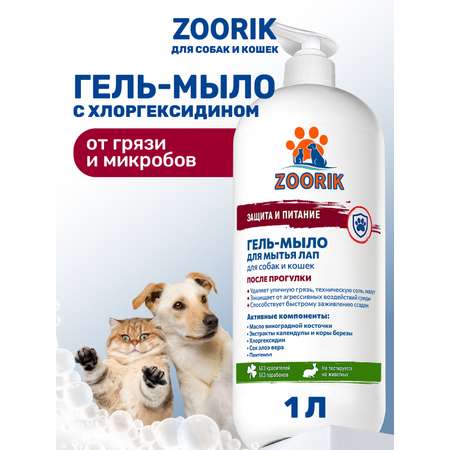 Гель мыло для мытья лап собак и кошек 1 литр ZOORIK Защита и питание создано для ежедневного ухода за животными после прогулок. Такой уход подходит для мелких и крупных пород животных, включая тех, кто склонен к раздражениям и дискомфорту: лабрадоров, мопсов, чихуахуа, шпицев, йорков, такс, пуделей, корги, ши-тцу, той терьеров, чихуахуа, французкого бульдога, а также для кошек любых типов шерсти, включая сфинксов и длинношерстных мейн-кунов. Очищающие мыло гипоаллергенное подходит для щенков и котят до года и взрослых животных. Его формула сочетает очищение, антимикробный эффект и питание кожи, обеспечивая комплексный уход за лапами и нижней частью тела. Хлоргексидин эффективно уничтожает уличные микробы, защищая кожу от инфекций и снижая риск воспалений. Экстракт коры березы оказывает противовирусное и противогрибковое действие, помогает снять раздражения и ускоряет заживление микроповреждений. Экстракт календулы смягчает, способствует восстановлению тканей и защищает от появления трещин. Сок алоэ вера глубоко увлажняет, предотвращает сухость и стянутость кожи. Масло виноградной косточки питает и делает кожу лап мягкой, восстанавливая её эластичность. Пантенол усиливает заживляющий эффект, снимает шелушение и дискомфорт. Растительный увлажняющий компонент сохраняет оптимальный уровень влаги и поддерживает здоровье кожи даже при частом мытье. Пенка для лап собаки и кошки подходит для регулярного применения, так как она мягко воздействует на кожу и шерсть, не нарушая её естественный барьер. Результат — чистые, ухоженные и защищённые лапы без раздражений и сухости, а ваш питомец чувствует комфорт и свежесть после каждой прогулки.