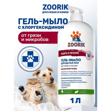 Гель мыло для мытья лап собак и кошек 1 литр с хлоргексидином 3% ZOORIK Защита и питание создано для ежедневного ухода за животными после прогулок. Такой уход подходит для мелких и крупных пород животных, включая тех, кто склонен к раздражениям и дискомфорту: лабрадоров, мопсов, чихуахуа, шпицев, йорков, такс, пуделей, корги, ши-тцу, той терьеров, чихуахуа, французкого бульдога, а также для кошек любых типов шерсти, включая сфинксов и длинношерстных мейн-кунов. Очищающие мыло гипоаллергенное подходит для щенков и котят до года и взрослых животных. Его формула сочетает очищение, антимикробный эффект и питание кожи, обеспечивая комплексный уход за лапами и нижней частью тела. Хлоргексидин эффективно уничтожает уличные микробы, защищая кожу от инфекций и снижая риск воспалений. Экстракт коры березы оказывает противовирусное и противогрибковое действие, помогает снять раздражения и ускоряет заживление микроповреждений. Экстракт календулы смягчает, способствует восстановлению тканей и защищает от появления трещин. Сок алоэ вера глубоко увлажняет, предотвращает сухость и стянутость кожи. Масло виноградной косточки питает и делает кожу лап мягкой, восстанавливая её эластичность. Пантенол усиливает заживляющий эффект, снимает шелушение и дискомфорт. Растительный увлажняющий компонент сохраняет оптимальный уровень влаги и поддерживает здоровье кожи даже при частом мытье. Пенка для лап собаки и кошки подходит для регулярного применения, так как она мягко воздействует на кожу и шерсть, не нарушая её естественный барьер. Результат — чистые, ухоженные и защищённые лапы без раздражений и сухости, а ваш питомец чувствует комфорт и свежесть после каждой прогулки.