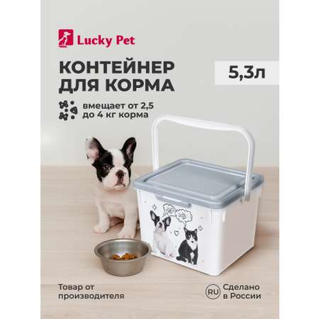 Контейнер Lucky pet 5,3л предназначен для хранения корма для животных. Крышка герметично фиксируется и защищает содержимое от посторонних запахов и влаги. Герметичная крышка надежно защищает корм от заветривания, попадания света, влаги и вредителей, а удобная прочная ручка помогает переносить контейнер с места на место. Плоская крышка позволит ставить один контейнер на другой для экономии места. Нанесённый с помощью технологии IML декор не стирается и не повреждается в процессе использования. В зависимости от плотности сухого корма, размера и формы гранул, контейнер может вместить от 2,5 до 4 кг корма.