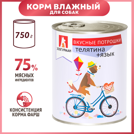 Корм для собак Зоогурман 750г Вкусные потрошки телятина-язык жестяная банка