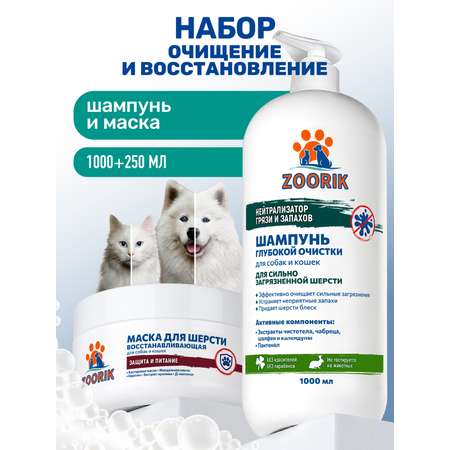 Профессиональный набор шампунь для собак и кошек 1 литр глубокой очистки и восстанавливающая маска для шерсти ZOORIK создан для заботливого ухода за шерстью и кожей питомцев. Такой уход подходит для длинношерстных, короткошерстных, гладкошерстных и бесшерстных, включая собак и кошек для разных пород: лабрадоров, мопсов, чихуахуа, шпицев, йорков, такс, пуделей, корги, ши-тцу, той терьеров, французского бульдога, а также для кошек любых типов шерсти, включая сфинксов и длинношерстных мейн-кунов. Зоошампунь собачий и кошачий гипоаллергенный разработан специально для животных, чья шерсть подвергается частым загрязнениям и нуждается в глубоком, но бережном очищении. Натуральные компоненты и растительные экстракты позволяют эффективно удалить грязь, жир и посторонние запахи псины, не пересушивая кожу. Экстракт чистотела и календулы обладает мощным дезинфицирующим и заживляющим эффектом, помогая поддерживать здоровье кожи. Шалфей регулирует выработку кожного сала, устраняет излишний блеск и продлевает ощущение свежести. Чабрец укрепляет корни шерсти, стимулирует рост, делает ее плотной, шелковистой и блестящей. Пантенол смягчает кожу, снимает раздражения, помогает быстрее восстановить поврежденные участки. Очищающий шампунь от запаха подходит для щенков и котят от 3х месяцев до года и взрослых животных, прекрасно очищает даже плотный подшерсток, облегчает расчесывание и придает ухоженный вид. Применение особенно актуально для животных, часто гуляющих на улице, участвующих в выставках или живущих в условиях повышенной активности. После использования шерсть идеально чистая, мягкая, послушная с приятным ароматом без зуда и сухости. Применение позволяет поддерживать здоровое состояние кожи, предотвращать появление перхоти и дарить питомцу ухоженный внешний вид.