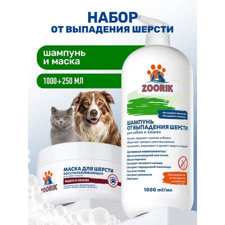 Профессиональный набор шампунь от выпадения шерсти 1 литр и восстанавливающая маска для шерсти 250 мл собак и кошек ZOORIK создан для бережного ухода кожей питомцев, склонных к ломкости, сухости и выпадению. Такой уход подходит для длинношерстных, короткошерстных, гладкошерстных, включая собак и кошек для разных пород: лабрадоров, мопсов, чихуахуа, шпицев, йорков, такс, пуделей, корги, ши-тцу, той терьеров, французского бульдога, а также для кошек любых типов шерсти и длинношерстных мейн-кунов. Очищающий шампунь подходит для щенков и котят от 3х месяцев до года и взрослых животных. Он обогащен маслами персика и виноградной косточки, которые питают и смягчают шерсть, делая её послушной и блестящей. Сок алоэ вера удерживает влагу, предотвращая пересыхание и раздражение. Экстракт ромашки и пантенол успокаивают кожу, снимают зуд и покраснения, дарят комфорт даже самым чувствительным питомцам. Экстракты зародышей пшеницы и хвоща укрепляют структуру волоса, способствуют росту, придают густоту и здоровье, облегчает расчесывание. Гипоаллергенный шампунь подходит для всех типов шерсти, особенно полезен для повреждённой и ослабленной. Маска питательная усиливает действие шампуня. Касторовое и миндальное масла насыщают полезными веществами, делают шерсть плотной, упругой и сияющей. Гидролизованный кератин укрепляет каждый волос, предотвращает ломкость и улучшает внешний вид. Экстракт крапивы стимулирует рост, а пантенол увлажняет и успокаивает кожу. Регулярное использование набора помогает справиться с сухостью, ломкостью и выпадением шерсти, возвращает питомцу ухоженный внешний вид. После применения шерсть животного становится мягкой, шелковистой, кожа — здоровой и защищённой.