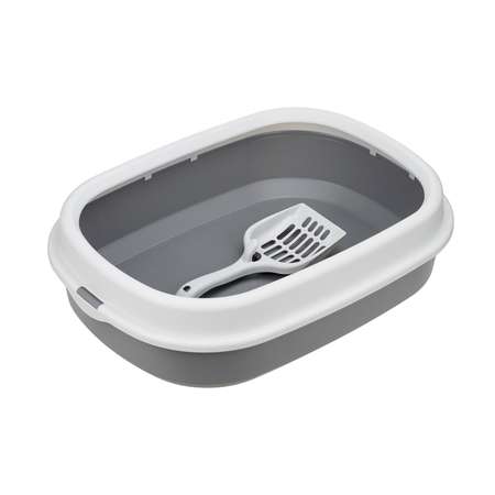 Лоток имеет эргономичную форму. Его верхний край закруглён, что предотвращает выпадение наполнителя при интенсивном использовании. К лотку прилагается совок для уборки, он легко крепится на бортик лотка.