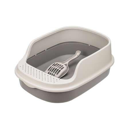 Лоток имеет эргономичную форму. Его высокий верхний край закруглён, что предотвращает выпадение наполнителя при интенсивном использовании. К лотку прилагается совок для уборки, он легко крепится на бортик лотка.