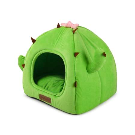 Нижняя поверхность снабжена нескользящим покрытием — питомец сможет удобно и безопасно забираться внутрь и выбираться наружу. Дизайн домика выполнен в виде кактуса характерного зелёного цвета, он декорирован мягкими «шипами» и розовым цветком. Этот домик не только подарит комфорт вашему любимцу, но и станет ярким акцентом интерьера любой комнаты.