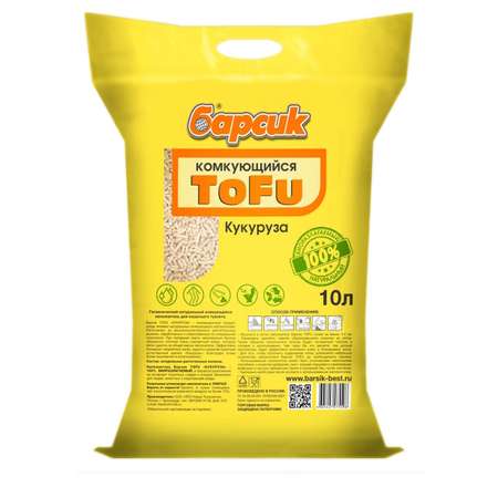 Барсик TOFU “Кукурузный” 10л – комкующийся наполнитель на основе натуральных растительных волокон, с гранулами светло-желтого цвета, обладает мягким не навязчивым ароматом кукурузы, эффективно впитывают влагу, образуя плотный компактный эластичный комок, который легко удалить из общей массы наполнителя, не прилипает к стенкам лотка; надолго БЛОКИРУЕТ неприятный ЗАПАХ.