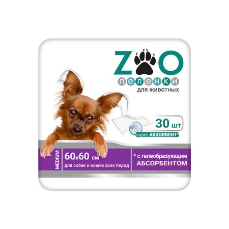 Пелёнки одноразовые впитывающие ZOO для животных 60x60 см 30 шт с суперабсорбентом