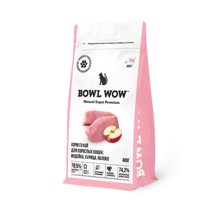 Корм сухой полнорационный BOWL WOW для взрослых кошек с индейкой, курицей и яблоком 400г