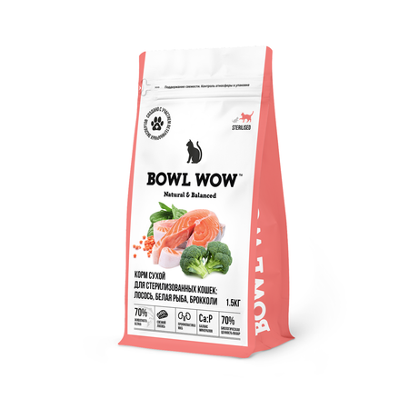 Корм сухой полнорационный BOWL WOW с лососем, белой рыбой и брокколи для стерилизованных кошек 1.5кг