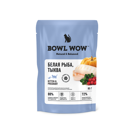 Цена Полнорационный влажный корм BOWL WOW в соусе для котят и беременных кошек с белой рыбой и тыквой 85г - 105 ₽.