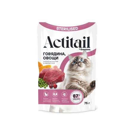 Цена Полнорационный влажный корм Actitail для стерилизованных кошек. Кусочки в соусе с говядиной и добавлением овощей 75 г - 75 ₽.