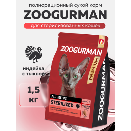 Полнорационный сухой корм для взрослых стерилизованных кошек всех пород ZOOGURMAN RED Индейка с тыквой 1,5 кг