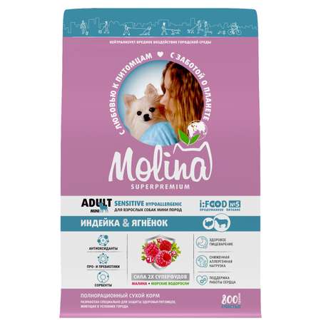 Корм для взрослых собак мелких пород Molina Adult mini sensitive сухой с индейкой и ягненком 0.8кг