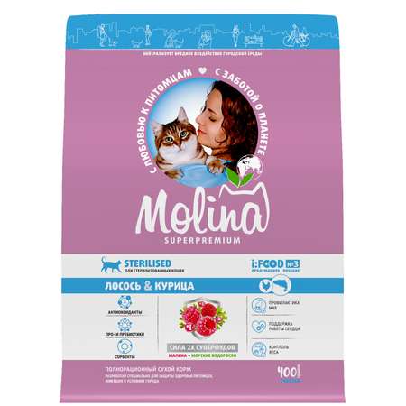 Корм для кошек сухой Molina для взрослых стерилизованных с лососем и курицей 0.4кг