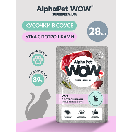 Пауч 28 шт Влажный полнорационный корм AlphaPet для кошек с чувствительным пищеварением утка с потрошками сочные ломтики 85 г