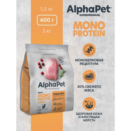 Сухой полнорационный корм холистик AlphaPet MONOPROTEIN из индейки для взрослых кошек AlphaPet Superpremium 0,4 кг