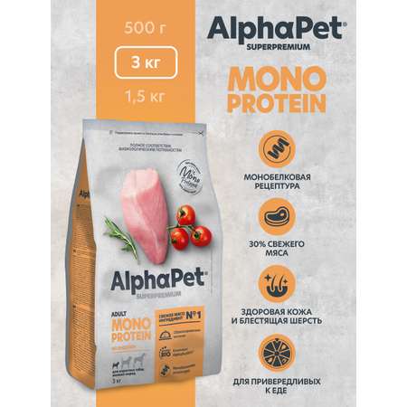 Цена Сухой полнорационный корм холистик AlphaPet MONOPROTEIN из индейки для взрослых собак мелких пород 3 кг - 3660 ₽.
