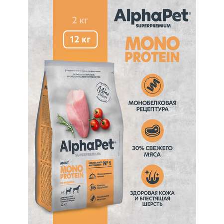 Цена Сухой полнорационный корм холистик AlphaPet MONOPROTEIN из индейки для взрослых собак средних и крупных пород 12 кг - 11528 ₽.
