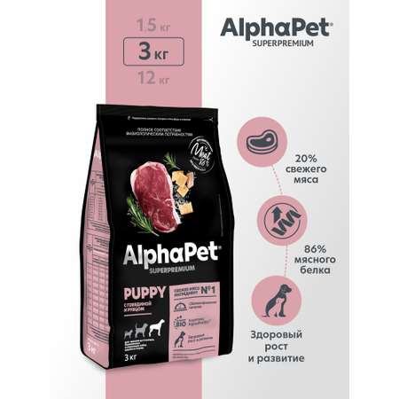 Цена Сухой полнорационный корм холистик AlphaPet с говядиной и рубцом для щенков до 6 месяцев и собак крупных пород 3 кг - 3492 ₽.