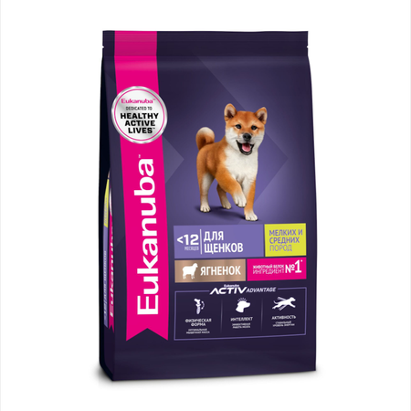 Корм сухой полнорационный EUKANUBA для щенков мелких и средних пород до 12 месяцев с ягненком специально разработан с учетом потребностей вашей активной собаки.